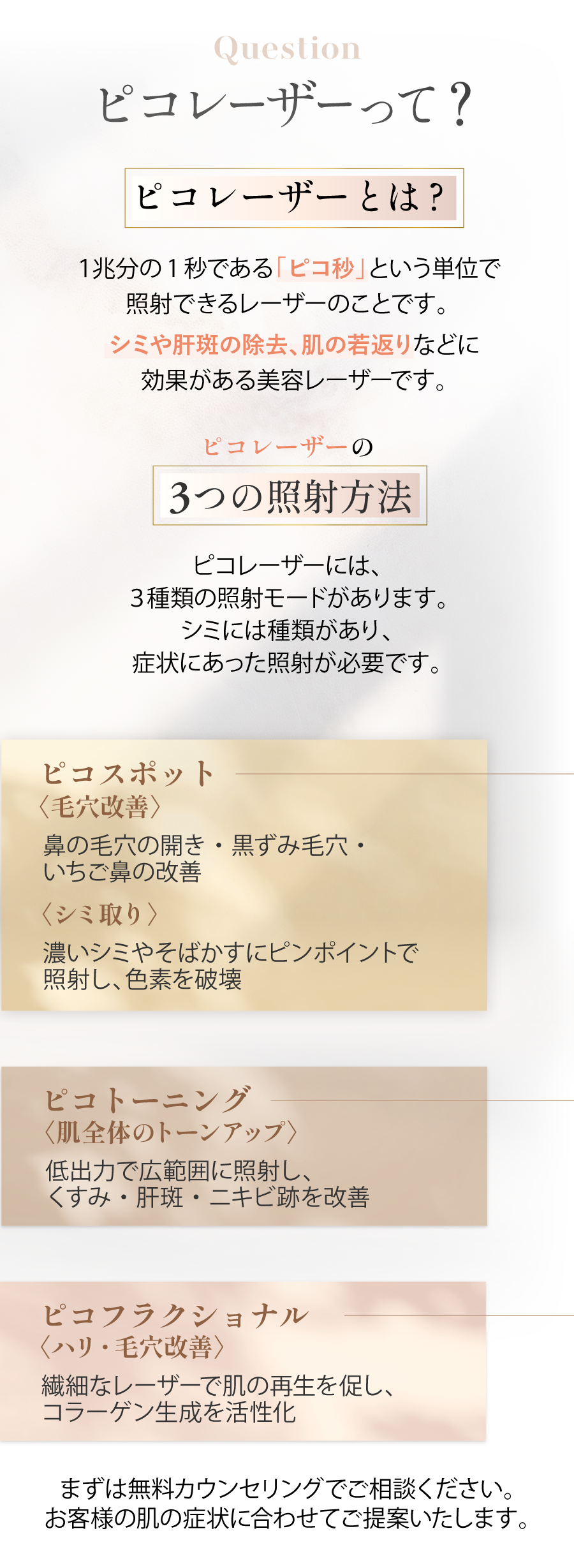 シミの場合、個人差はありますが、1~2回で消えます。タトゥー、アザの場合6~10回、アートメイクの場合3~6回、もしくはそれ以上かかる場合があります。